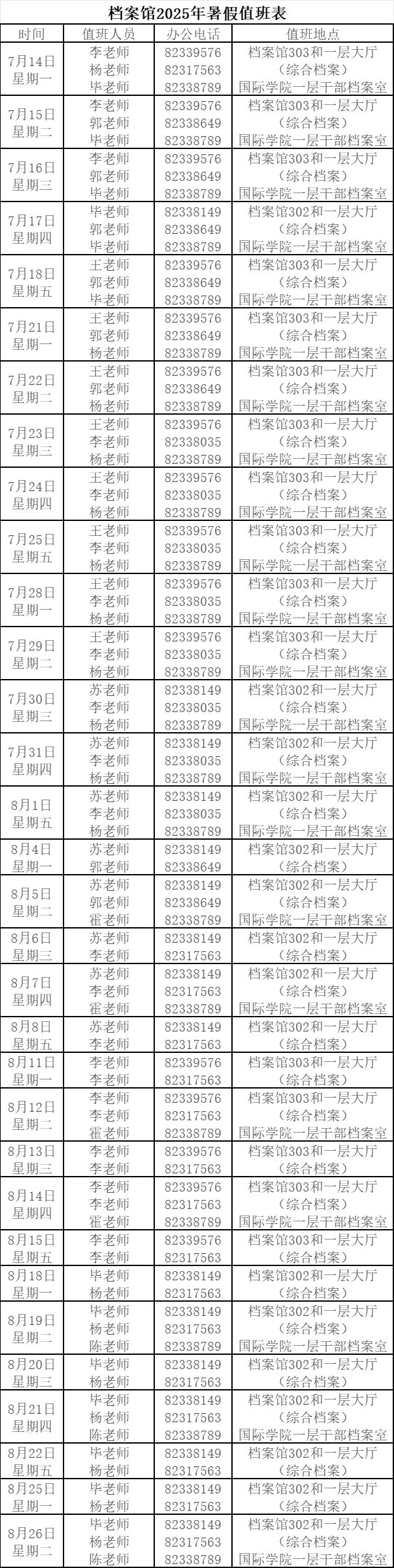 根据学校《关于2025年暑假放假安排的通知及下半年活动安排的通知》(党政办函字〔2025〕8号)以及党政办公室暑假值班的工作要求,档案馆2025年7月10、11日,8月27、28、29日正常上班,暑假放假时间为2025年7月14日(星期一)至8月26日(星期二)。暑假值班时间为工作日上午8:30-11:30,下午2:00-5:00。具体值班安排见附表。